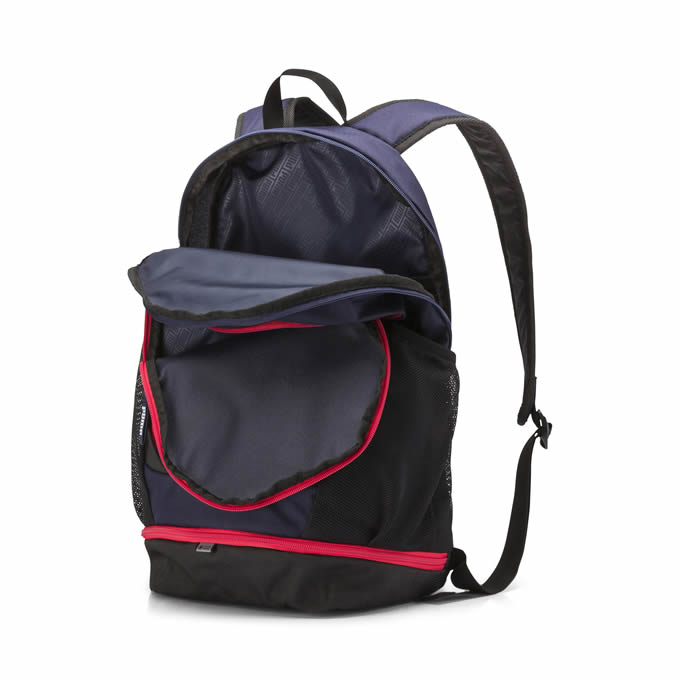 底部のシューズコンパートメントを含め、3つのコンパートメントからなる多機能構造。