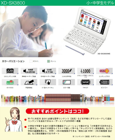 無料(メッセージカード・熨斗も承ります) Wi-Fi対応※ で手軽にコンテンツを追加可能 小学校外国語・英語必修の準備、中学校主要5教科に対応した学習コンテンツを収録 “EX-word”2020年度モデル CASIO XD-SX3800 小学生の英語学習から、中学校での5教科の予習・復習、英検®・高校受験対策まで幅広く使える 小学校外国語・英語必修の準備、中学校主要5教科に対応した学習コンテンツを収録。